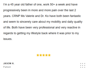 Dr. Ko adds, “I am most proud of my patients who achieve their goals of pain relief under my care. This is the greatest satisfaction for anyone who treats chronic pain.”